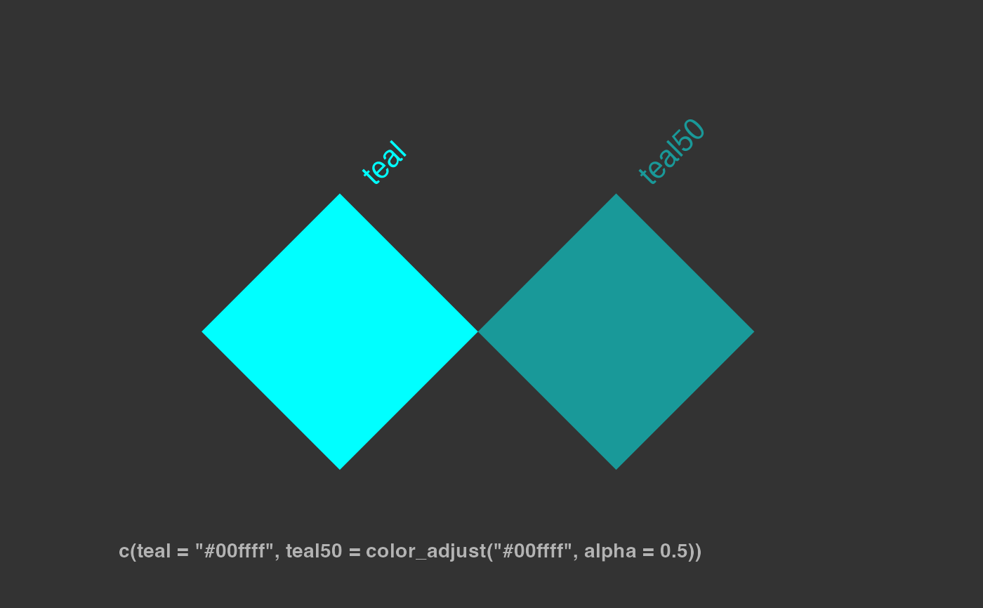previewcolor(c(teal = "#00ffff", teal50 = color_adjust("#00ffff", alpha = 0.5)))